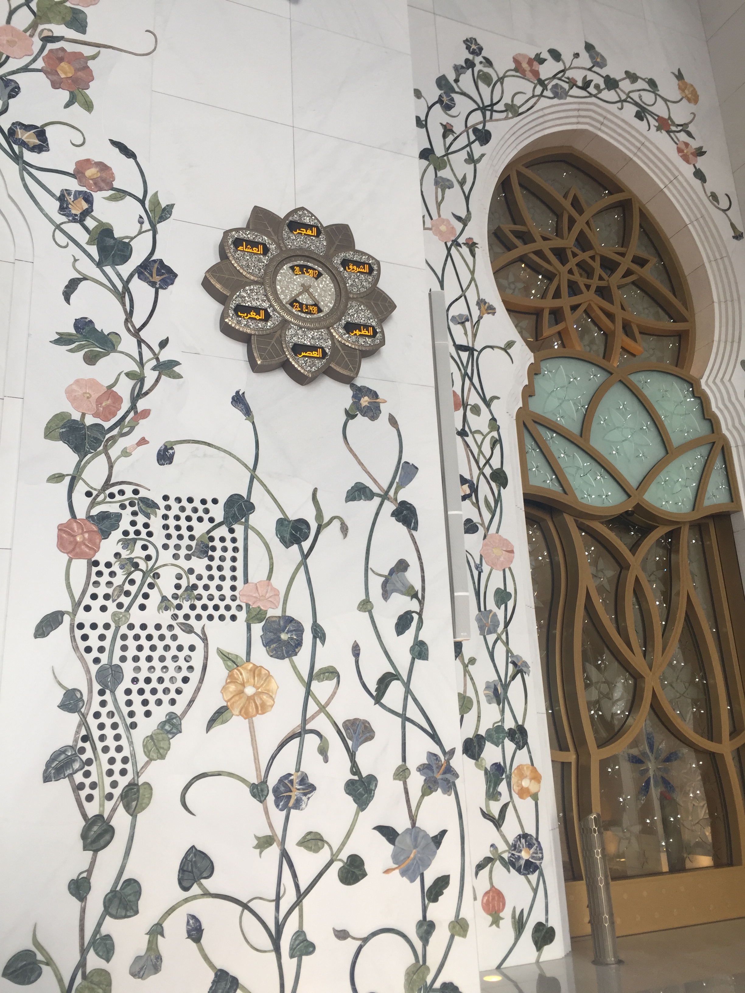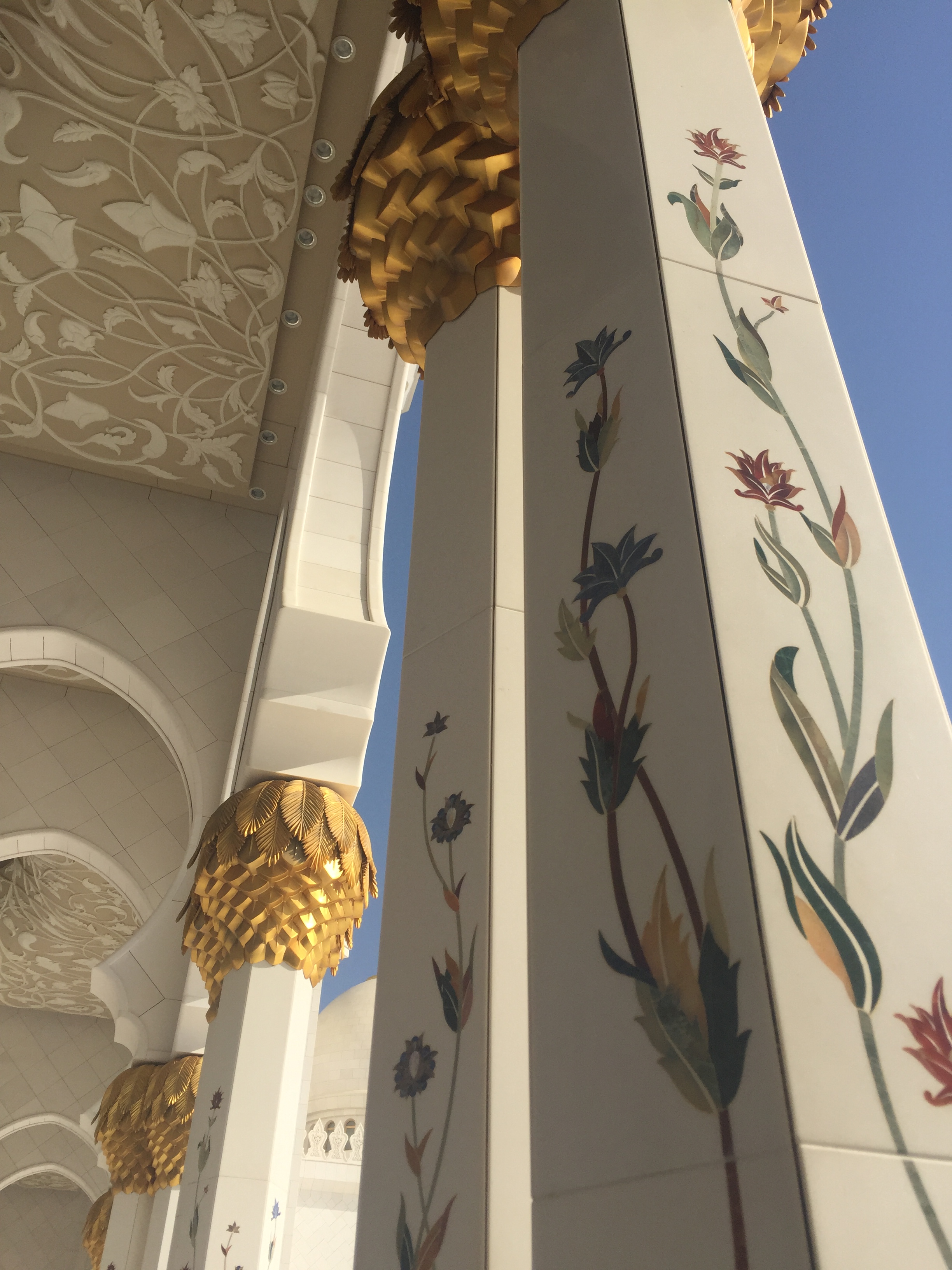 And now, it’s time to plumb the depths of this mosque! When you enter, you’ll notice these beautiful beautiful white columns with its gold tips and the exquisitely hand painted flowers. Not only is it aesthetically beautiful, but there’s actually meaning behind the flower paintings! Columns in the north area of the mosque show flowers that only grow in the Northern Hemisphere, while those in the south area show flowers that only grow in the Southern Hemisphere. Isn’t that so amazing?